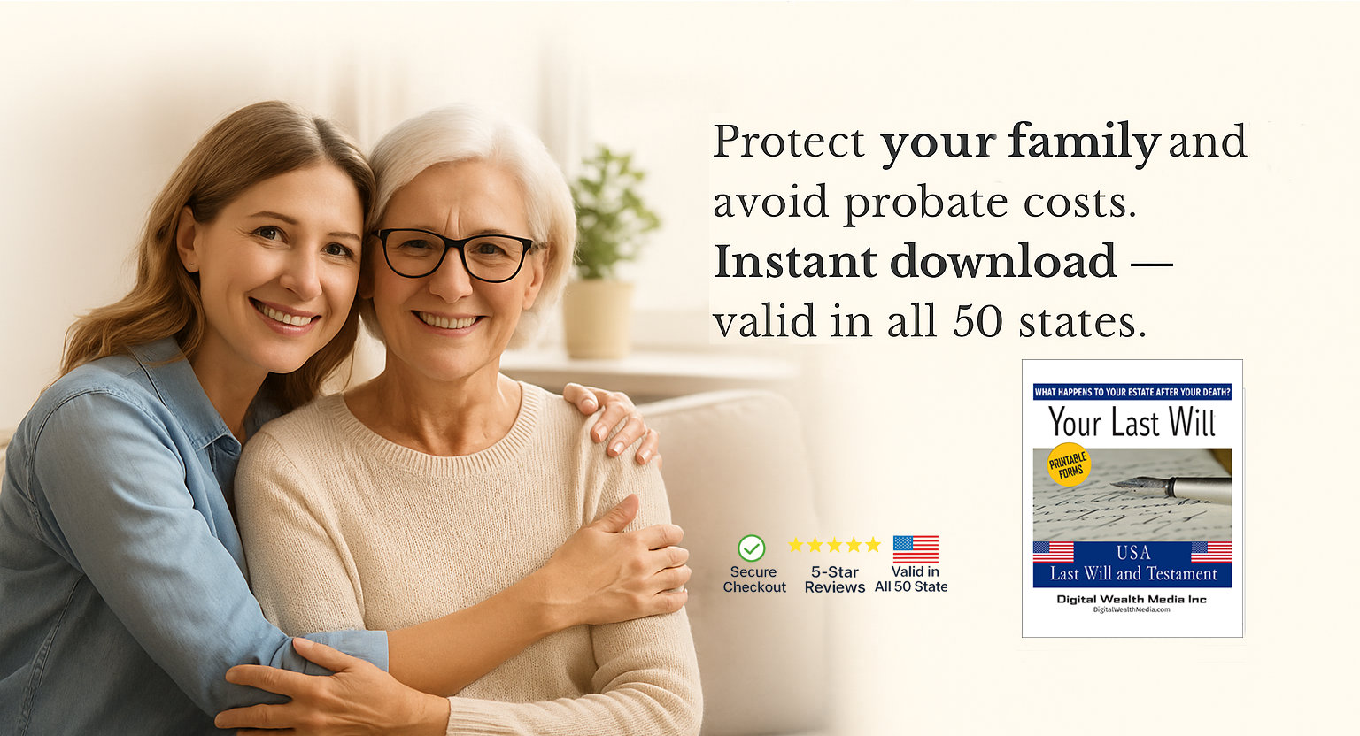 Protect your family’s future with the Last Will, Digital Will, Living Will and 6 bonus guides — all in one plan. Instant download, valid in all 50 states, risk-free with our 60-day guarantee.